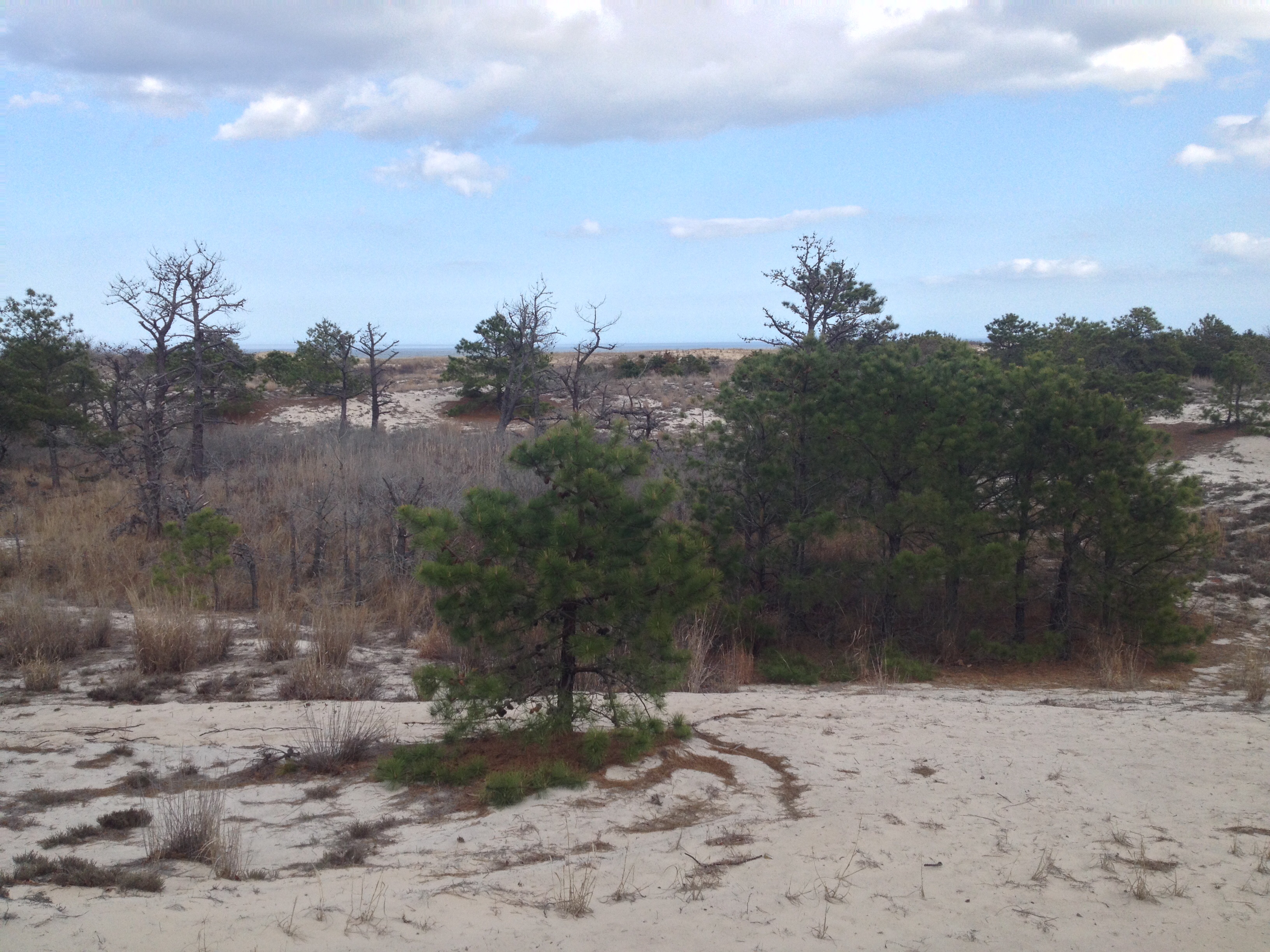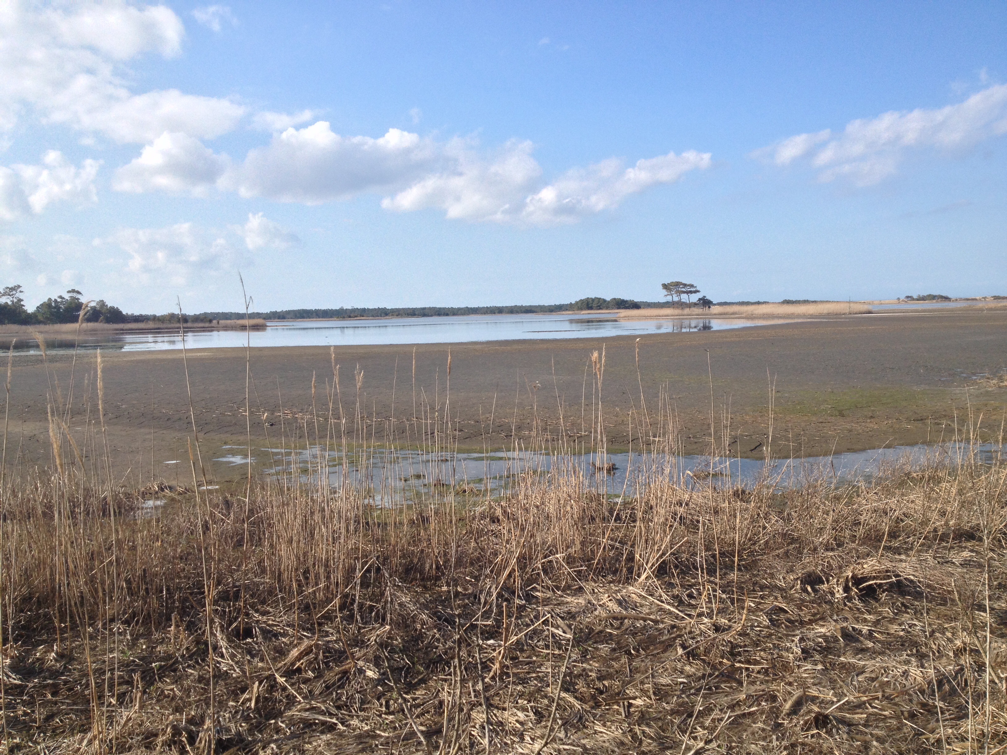 The trail began by winding around the “pond”–actually, a saltwater lagoon surrounded by drab, sand-colored marsh grasses that contrasted starkly with the green scrub pines and blue water.