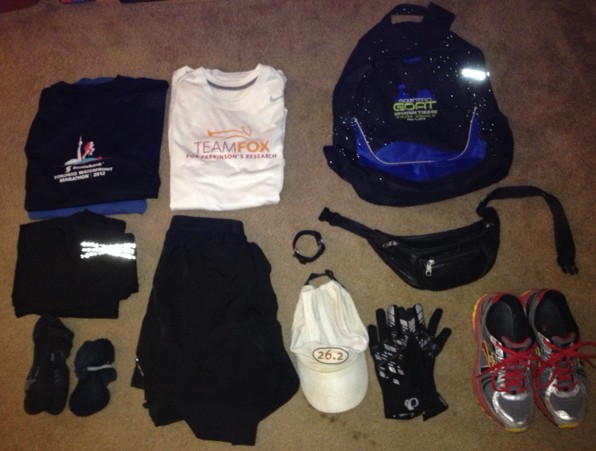 As I usually do, I packed more gear than necessary, including long pants, gloves and a long-sleeve shirt for layering which I probably won’t use. There’s the all-important Team Fox T-shirt, which I have to wear for obvious reasons, the ubiquitous fanny pack (much to Team Love Nugget and Andy Wheatcroft’s disgust) and my trusty, sweat-stained 26.2 hat (much to Tessa’s disgust) that has accompanied me on every marathon except Toronto.