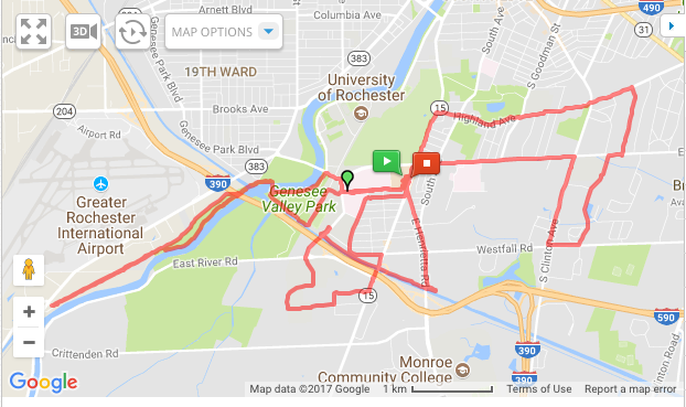 So, after a bathroom/hydration/energy gel break, I was in with the six 9:30 group runners as they made their way out to the trails on the west side of the U of R campus. As it turned out, this loop was probably the best testimony of the day in favor of group long runs. The camaraderie helped me push through a couple of tough spots; the trails were fast and more conducive to focused running; and Frankie, our pace leader, listened to the needs of the smaller group and facilitated a faster pace, which was much more to my liking and closer to the pace I was hoping for.
