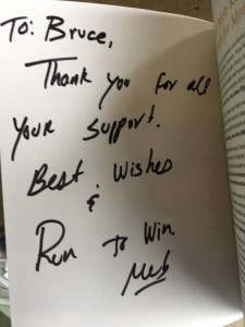 But nothing prepared me for what happened next. As he was signing, I attempted a little casual chitchat, telling him that I was taking his words about goal setting in the first chapter of the book to heart. “You’re going to help me qualify for Boston,” I quipped.
