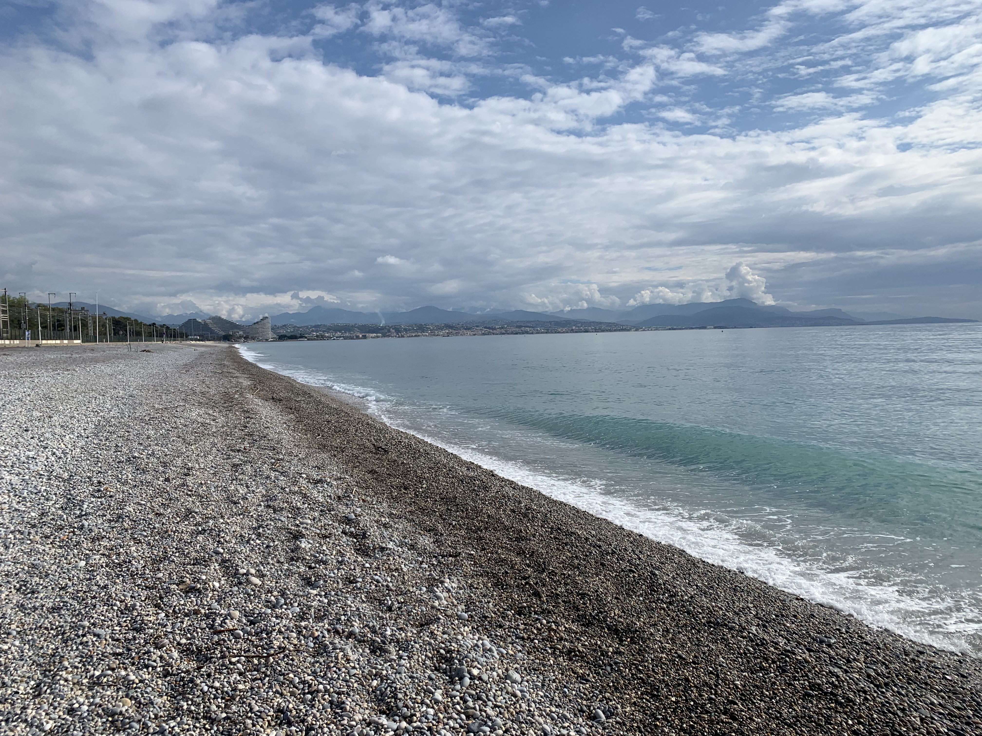 On the Route de Bord du Mer looking toward Nice with stunning views of the Préalpes d’Azur mountains in the background